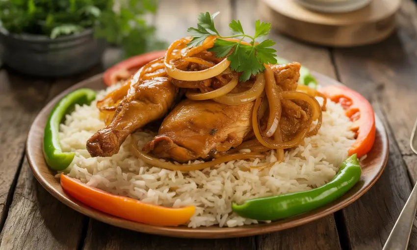 Découvrez notre plat phare, le poulet yassa, mariné dans des épices et servi avec du riz parfumé.